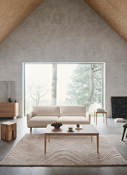 Pour marquer son arrivée à la direction artistique, Helena Christensen signe Ø, un fauteuil enveloppant inspiré des petites îles danoises dont elle est originaire. « Ø offre une expérience profonde, semblable à un cocon, créant un sanctuaire personnel. Je voulais un fauteuil dans lequel on puisse s’enfoncer et laisser ses pensées vagabonder », confie-t-elle. Un modèle qui s’accompagne d’une série de pièces complémentaires : le tableau, le tapis et la sculpture Flora, ainsi que le coussin Teddy.