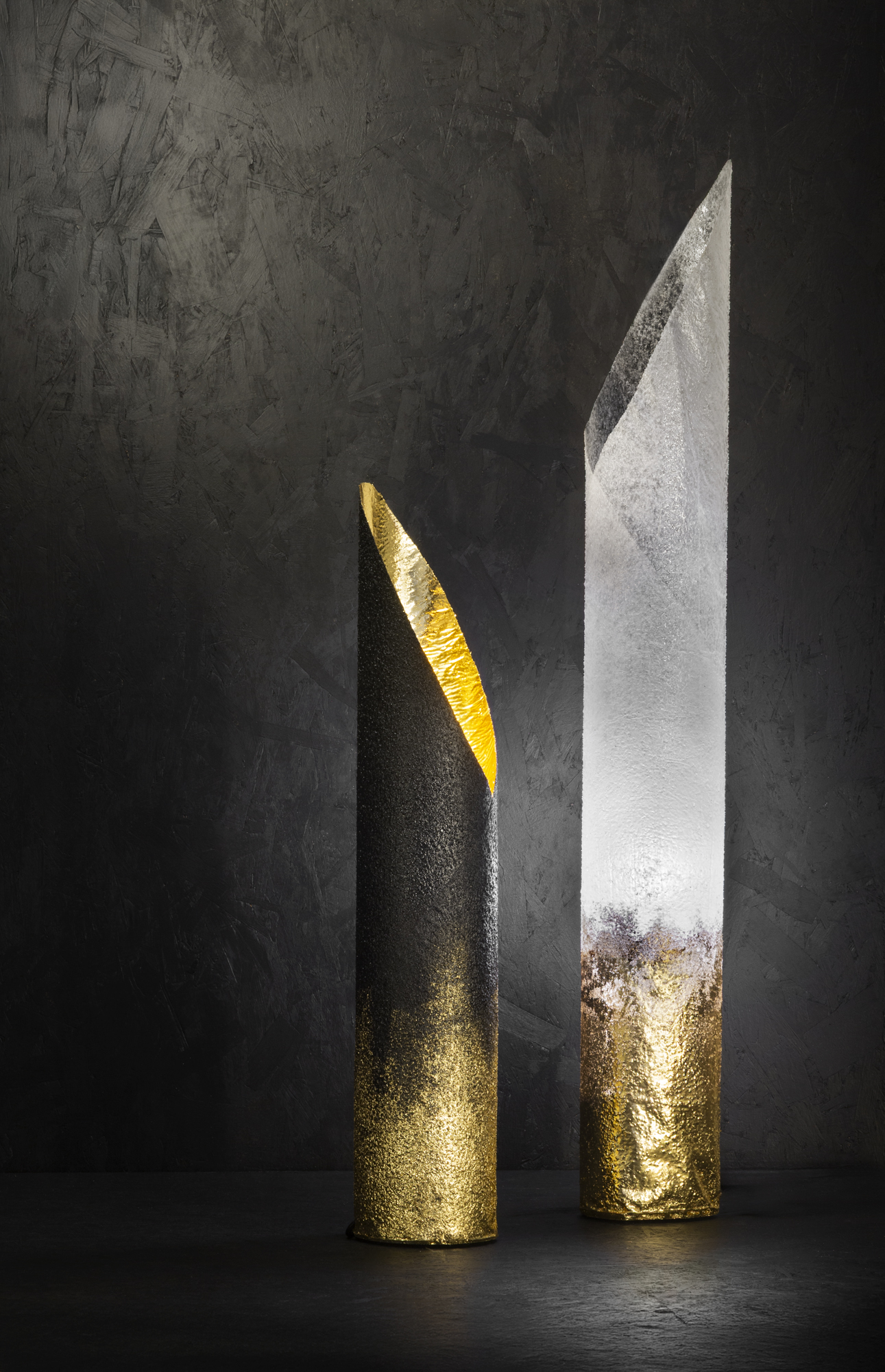Il y a des matériaux dont on connaît à l’avance le rendu, et d’autres, issus d’alchimies novatrices, qui ouvrent de nouvelles pistes. Attiré par la résine et ses propriétés techniques, Hadrien Hach entame une démarche prospective en quête de la bonne association. Travaillant d’abord avec de la fibre de verre grâce à laquelle il obtient une transparence centrale dans ses créations, Hadrien Hach finit par adopter le tissu de soie. « C’est un matériau que j’ai découvert un peu par hasard, et qui donne à la résine un effet translucide, presque givré » explique-t-il. Travaillé sous forme de feuilles enduites, le textile est ensuite mis à sécher pendant une journée dans la forme désirée. Convaincu que « la matérialité conduit à la forme », le designer, dont l’idée de flottement avait guidé des premiers prototypes, s’oriente finalement vers un style plus monolithique. Inspiré notamment par la tour The Shard, célèbre gratte-ciel londonien où il a vécu deux ans, ou par l’architecture vernaculaire africaine, il signe six familles de luminaires, dont la première s’intitule Frozen Katana. Un clin d’œil évident aux prémices de cette première collection, et au Japon, renforcé par l’usage de la feuille d’or. Un revêtement en écho “au temple de l’or de Kyoto et sans doute un peu au château de Versailles, à côté duquel j’ai grandi », raconte-il. Appliquées par fragments ou bien dégradées à l’alcool, ces dorures jouent avec la lumière. Que ce soit en reflétant l’environnement lorsque la lampe est éteinte, ou en filtrant la lumière lorsqu’elle est allumée, à l’image de l’applique Arrowslit dont le maillage réalisé grâce à une résille évoque une pixellisation ou une cartographie urbaine.