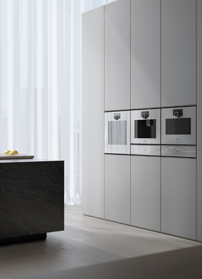 Au-delà de l’esthétique, ces deux gammes sont le fruit d’une réinterprétation complète des précédents modèles ne conservant avec eux qu’une simple vis en commun. Repartie de zéro, l’équipe design composée d’une dizaine de personnes, épaulée par le centre de recherche et développement, a notamment repensé la cavité du four en dissimulant le système de chauffe derrière les parois. Cette configuration a permis d’augmenter le volume de l’appareil - disponible en 60 cm ou 76 cm dans la version grande taille - tout en posant de nouveaux défis techniques liés à la montée en température. Pour y répondre, la puissance a été augmentée de près de 40 %, imposant une révision complète de l’émail intérieur afin d’éviter les fissures causées par la différence de dilatation entre le métal et le verre. Un élément d’autant plus important que ces nouveaux fours peuvent dépasser les 300°, en partie grâce à une nouvelle vitre constituée de cinq épaisseurs de verre. Minimaliste et expressif à la fois, le style Gaggenau est avant tout celui d’une technicité au service du goût !