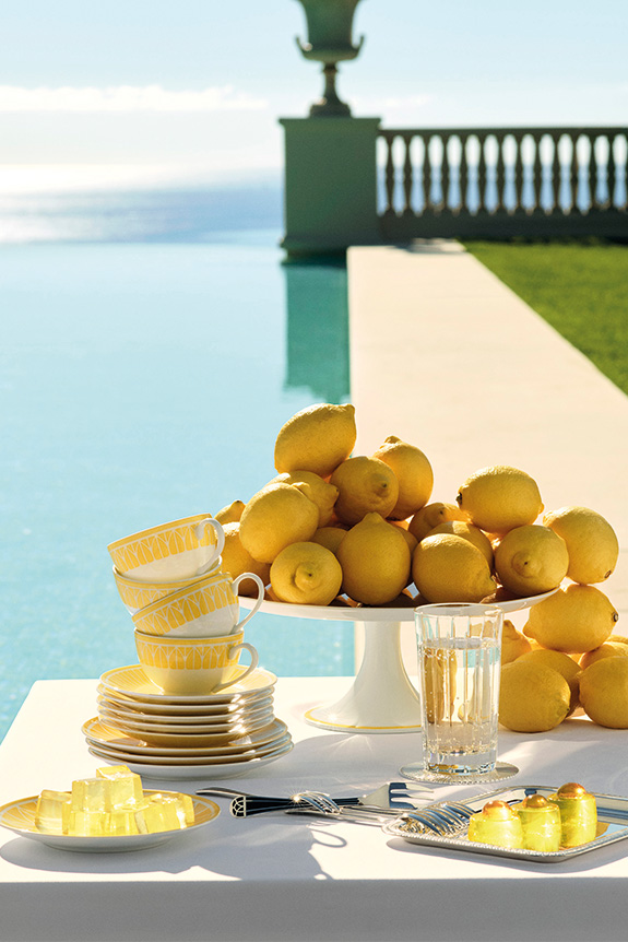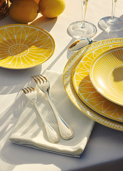 Dévoilée comme une déclinaison estivale des collections Malmaison et Malmaison Impériale, la ligne s’inscrit dans une continuité stylistique tout en opérant un déplacement sensible. Fidèle aux codes du style Empire - palmettes, symétries, motifs ornementaux - elle introduit pour la première fois la couleur, avec un jaune profond qui vient capter et diffuser la lumière. Depuis plus d’un siècle, Malmaison incarne un raffinement classique inspiré du château lié à Napoléon Bonaparte et l’Impératrice Joséphine. Avec Riviera, cet héritage se réinterprète dans un registre plus quotidien, à travers lequel les décors, tracés à main levée, déploient rosaces et rayons dans une composition vivante, où chaque pièce devient une variation autour d’un même motif solaire.