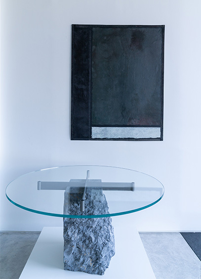 Initiée conjointement par le galeriste Jean-Jacques Dutko et Jean-Michel Wilmotte, la collection, ode à l’imperfection des masses naturelles et à la précision des lignes manufacturées, s’inscrit en résonance avec l'œuvre de Jean-Pierre Pincemin. Contemporain de l’architecte qui le collectionne, le peintre se distingue par un travail des trames et des aplats nuancés. Une approche de la peinture moderne qui entre donc naturellement en dialogue avec Rockstone. Deux manières de concevoir les volumes, mais un même goût pour la création et ses déclinaisons. Forme d’évolution libre et intuitive de sa précédente exposition, Doppia V, la collection présentée jusqu'au 31 mai par l’architecte est avant tout le fruit d’une démarche prospective et intuitive de la matière. Une forme de cycle que Jean-Michel Wilmotte envisage de compléter avec une dernière collection dédiée à la roche et la couleur.