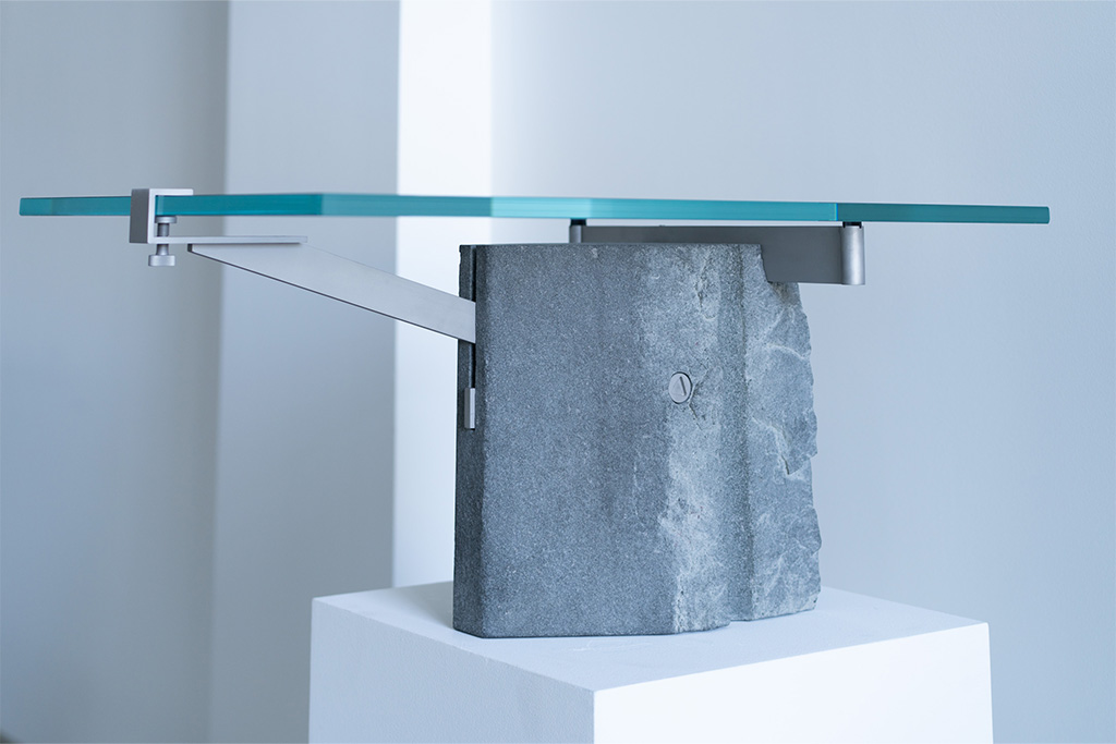 Jean-Michel Wilmotte et la galerie Dutko exposent Rockstone jusqu’au 31 mai. Une collection dans laquelle le verre et l’acier soulignent l’imperfection des pierres destinées au rebut.