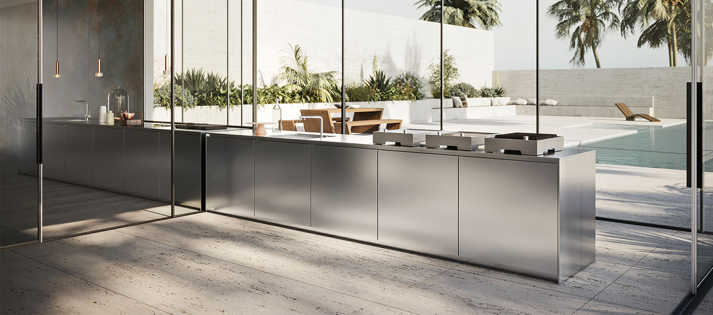 Au cœur du projet, la porte Blade en acier inoxydable AISI 316, associée à un panneau en nid d’abeille en aluminium, conjugue légèreté structurelle, robustesse et stabilité, idéales pour les terrasses, vérandas ou abords de piscine. La structure interne, les éléments bas, le plan de travail en inox avec évier intégré composent ainsi un système cohérent, où la précision des finitions et la qualité des matériaux traduisent l’exigence technologique de la marque. Les plaques de cuisson autoportantes Mate - en induction, teppanyaki et barbecue - sont installées directement sur le plan et permettent d’élargir les usages et transforment la préparation des repas en une expérience conviviale.