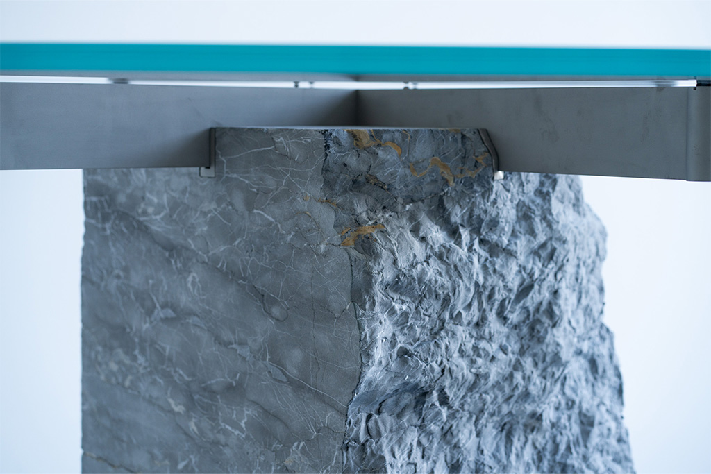 Présentées au sein de la galerie Dutko, les quinze pièces ont été dessinées comme autant de supports aux singularités des roches. Choisies parmi les rebuts des carrières de Carrare - qui ont donné leurs noms aux pièces - les différentes typologies de mobilier se déclinent en marbre, granit et pierres calcaires. Fendues, sciées, percées ou plus grossièrement arrachées d’un autre bloc, les pierres portent les stigmates de leur exploitation. Plus que le veinage ou la granulométrie de la roche, ce sont les conséquences de l'extraction qui servent de point de départ à l'architecte qui adapte son dessin aux accidents d’origine humaine. « Je conçois et découpe les blocs pour mettre en exergue les parties les plus brutales. » Des aspérités dans les masses que l’architecte encadre ou souligne avec « l’exactitude et la finesse de l’acier microsablé et du verre ». Une recherche d’équilibre née de la confrontation des matériaux et de leur association, par vissage ou encastrement. Si la collection a été réalisée « comme un hobby, pour penser à autre chose », elle fait évidemment écho aux principes constructifs utilisés par l'architecte dans certains projets. Et parmi eux, une future usine aéronautique prochainement livrée par l’agence à Toulouse confie Jean-Michel Wilmotte.