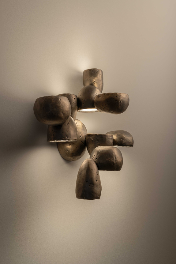 D’abord intéressés par l’idée de propagation, les designers ont commencé « par travailler en deux dimensions, sur papier, et par l'intermédiaire de matériaux physiques tels que les croquis au crayon et à l'encre ». Une phase qui a permis aux premières ébauches d’émerger. Ce n’est que dans un second temps que l’étude des formes a débuté, et ce, de manière empirique. « Nous avons d’abord créé des masses à l’aide de papier aluminium puis d’argile. Nous préférions travailler le matériau physiquement et ensuite passer à sa transformation numérique en le scannant en trois dimensions. » Une méthode de travail qui a poussé les deux designers vers le moulage au sable. Une technique artisanale, réalisée dans une fonderie italienne, permettant de combiner les détails des moules en terre réalisés à la main, et la matérialité brute et authentique de la fonte. Réalisé en aluminium, chaque module est ensuite retravaillé à la main et patiné dans l’un des cinq coloris disponibles (aluminium brut, aluminium poli, noirci, bronzé, blanc minéral). Dotés d’une source lumineuse, les dômes concaves sont ensuite refermés avec une lamelle de verre opalin, laissant passer une lumière homogène et permettant à chacun de révéler les aspérités de son voisin. Une cohabitation rappelant, à la lumière de Scarabei, la force de la composition.
