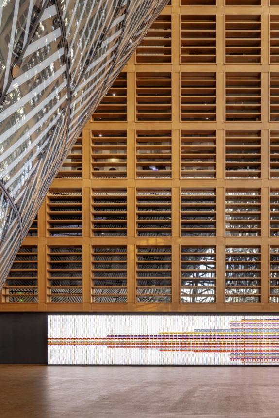 « Dans l’ADN de notre studio, nous souhaitons montrer la complexité plutôt que l’éviter », exprime Adeline Rispal, et c’est clairement ce qui ressort de cette présentation. En lien avec le Studio Irresistible et avec son équipe, elle a conçu une scénographie qui file la métaphore du tissage, du réseau, de la construction en présentant des oeuvres magistrales. Ainsi, dans l’atrium, se déploient les « Ailes » , reprenant un motif construit autour de l’imbrication des différents 27 drapeaux et 37 couleurs des 27 représentants.