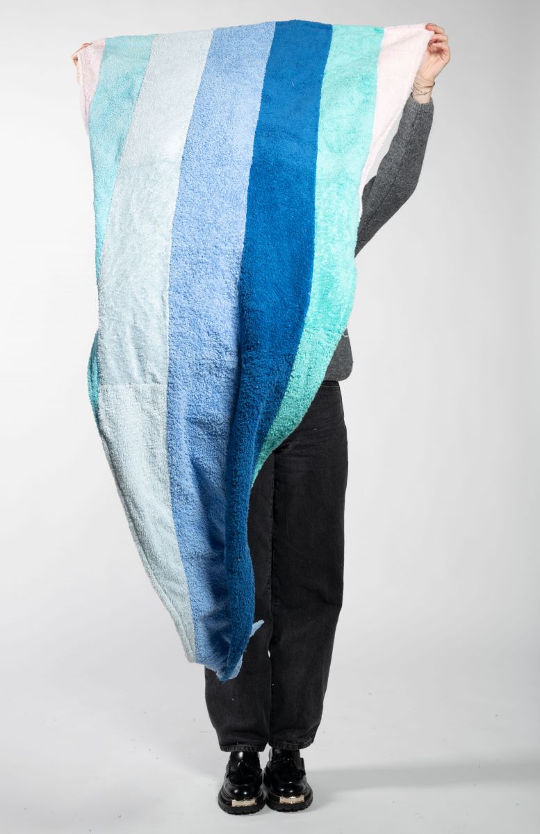 Entre tapis et tapisserie, cette belle pièce design est révélatrice d’un savoir-faire textile très abouti, et d’une attention poussée aux couleurs et formes. S’apparentant à une structure organique, presque mouvante, l’œuvre semble jouer sur sa fonction – un tapis utilitaire – et ce que l’on croit percevoir d’elle, une forme sans formes, au chromatisme vitaminé et pop.